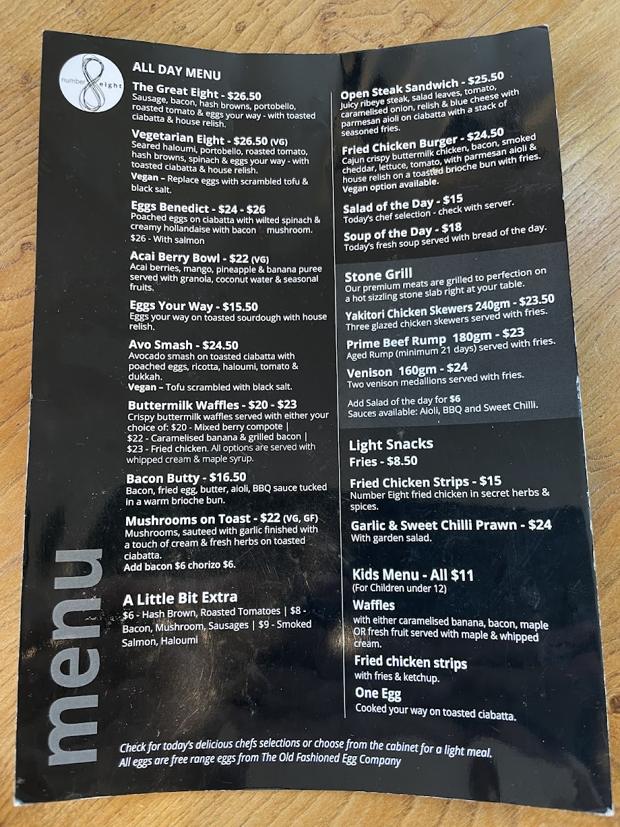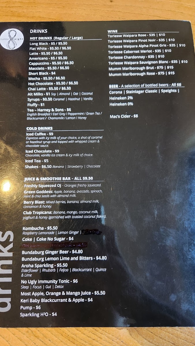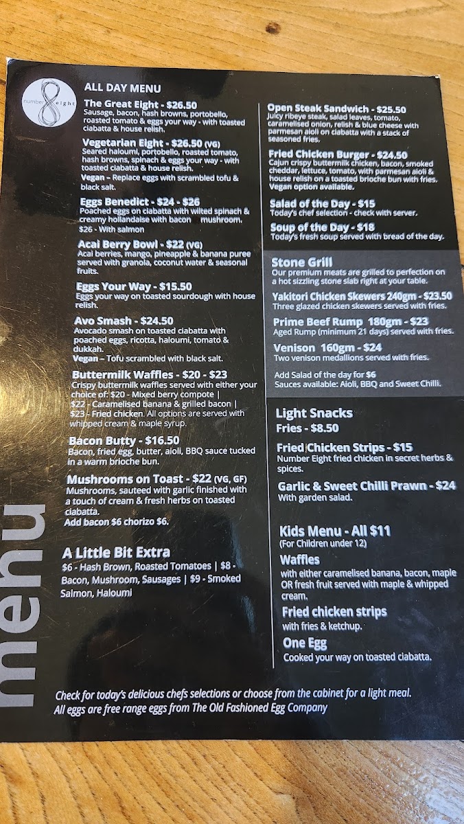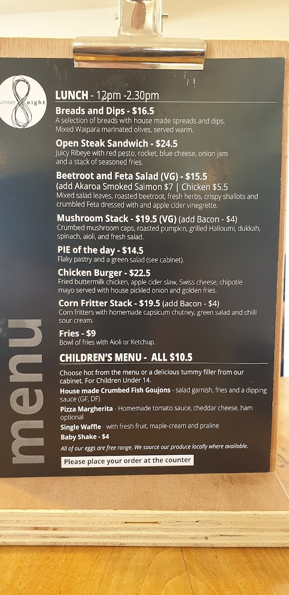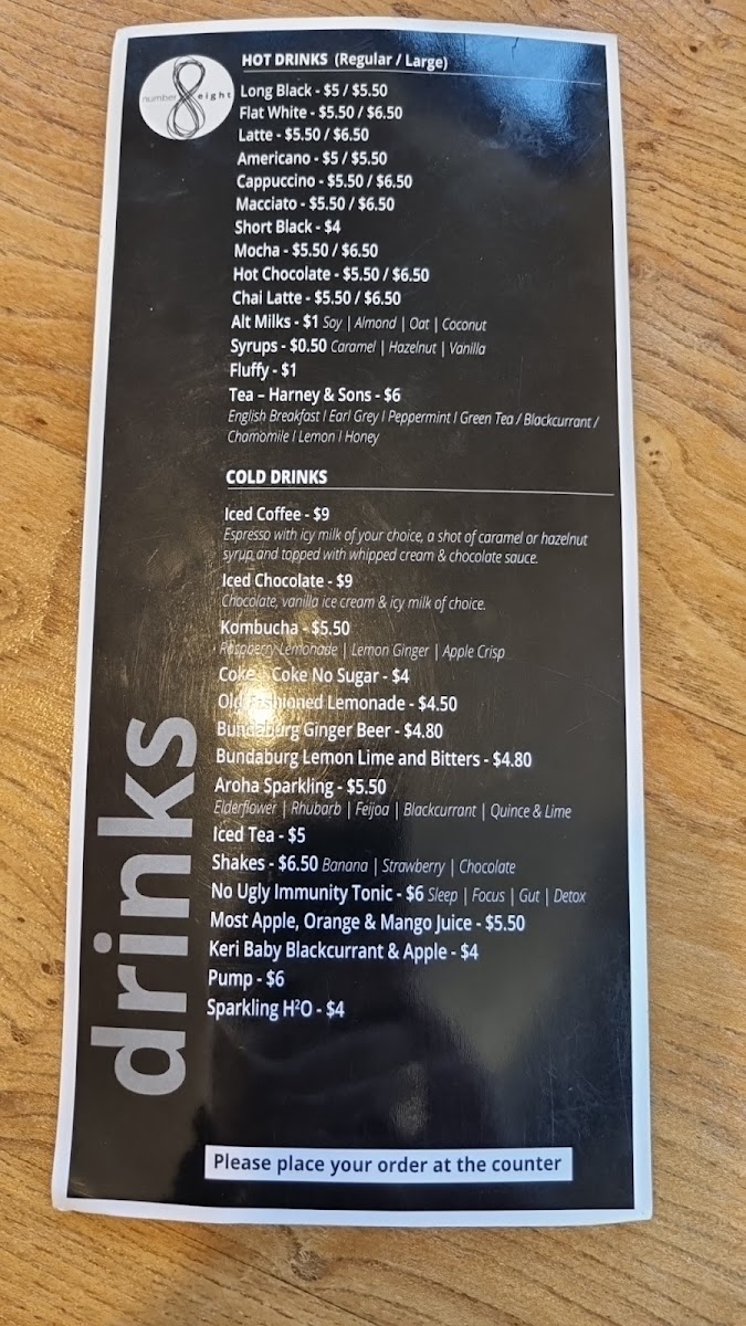 Welcome to Number Eight Cafe, where vibrant flavors meet a cozy atmosphere in Cheviot, New Zealand. Nestled at 8 Hall Street, this delightful cafe offers a diverse menu that promises to satisfy any palate. Start your day with expertly crafted hot drinks, including a rich long black or a creamy flat white, each made to perfection. If you're in the mood for something savory, try their stone grill specialties like yakitori chicken skewers or succulent prime beef rump, which have garnered rave reviews for freshness and presentation.
